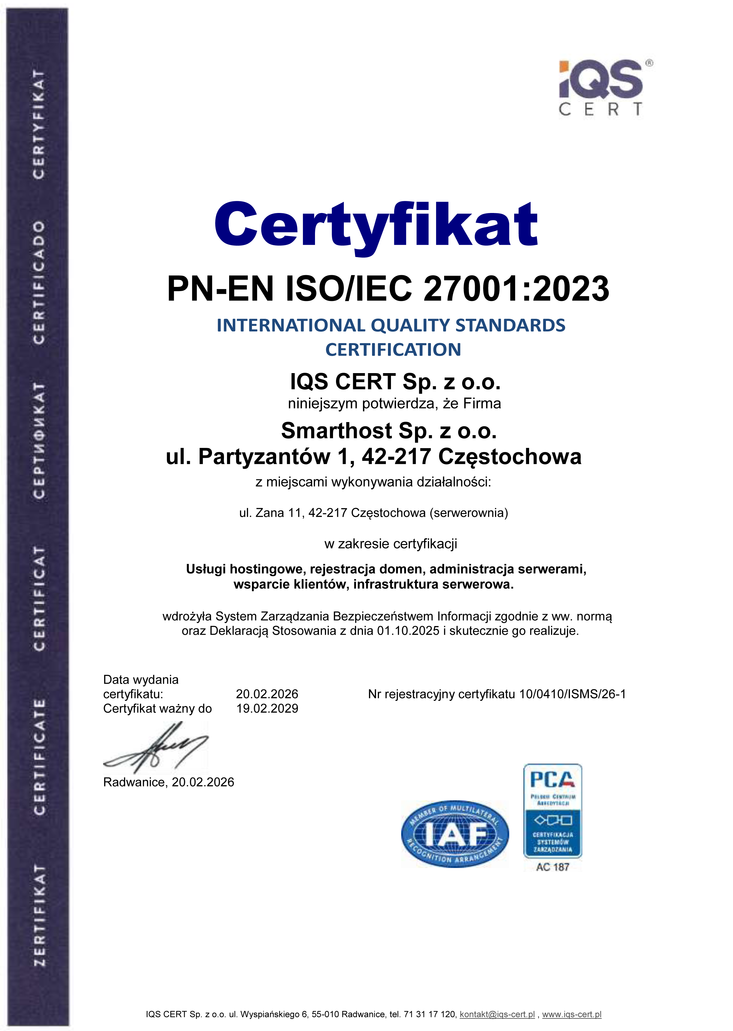 Pamiętaj, że zagrożenia czają się na każdym kroku. Wybierając hosting, warto postawić na firmę, która nie tylko mówi o bezpieczeństwie, ale poddaje się surowym kontrolom zewnętrznych audytorów, którzy mogą je potwierdzić. Twoje dane w Smarthost są bezpieczne. Teraz mamy na to oficjalny certyfikat.
